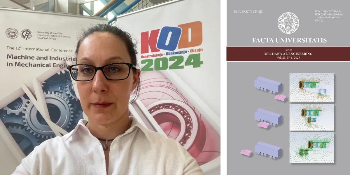 Participare la conferința KOD 2024 - Machine and Industrial Design in Mechanical Engineering’ (stânga). Coperta publicației FACTA UNIVERSITATIS - Series Mechanical Engineering’ (dreapta).